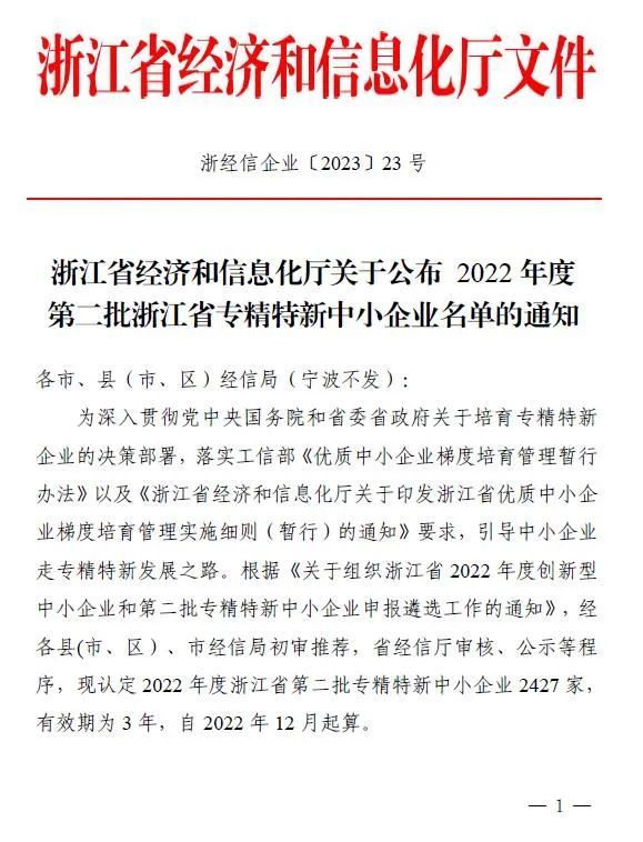 根据浙江省经济和信息化厅于2023年1月20日《关于公布2022年度第二批浙江省专精特新中小企业名单的通知》和2023年1月12日发布的《关于公布2022年度“浙江制造精品”名单的通知》,我司于众多优秀的企业中脱颖而出,荣获2022年度浙江省“专精特新”中小企业和“浙江制造精品”企业认定。