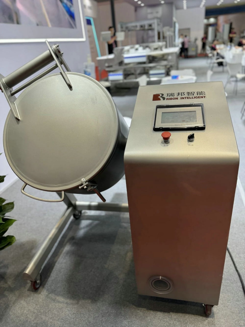 翻转式制冷滚揉机: 瑞邦智能全新研发,机型结构简单,适合实验室少量打样加工或中小型肉制品公司、酒店厨房加工生产,可以大大缩短腌制浸泡时间、改善效果,提高肉品品质。