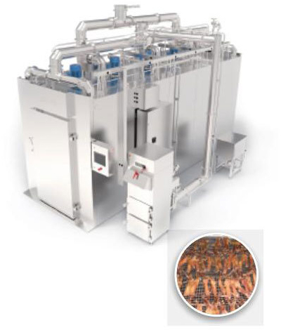 RYXB型侧热式水平气流烟熏炉,具有干燥、烟熏、蒸煮、烘烤功能,主要用于培根、肉脯、禽类制品、香肠、火腿、肉干等肉类产品的热加工过程。特别适合于平铺类产品的加工。