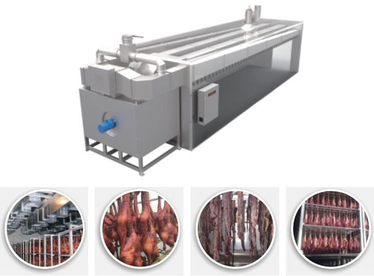 冷(热)风干燥室不同于传统的单车模块式结构烟熏炉,主要由传动系统,换热系统,风循环系统,风量动态控制装置,可调多孔式回风系统,出风装置,排风系统及清洗系统等结构组成。