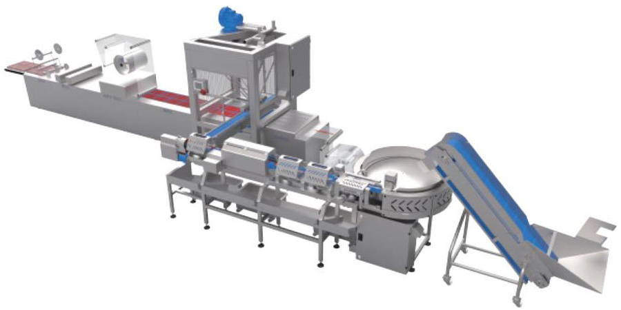 2.自动整列输送机:将每根香肠排列整齐并保持一定的间隔,自动检测肠类规格将不符合包装要求的肠类剔除,再将香肠整齐排列到蜘蛛手机器人抓取线上。