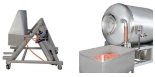 容量500L,可移动,通过真空管和滚揉桶连接。可以加快吸料效率,特别对较大肉块或含水很低的肉馅非常有效。可以选用翻转装料机装料。